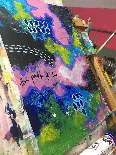 The pink across the centre of this page made me think about the path of life. It has wiggles. It has blind ends that seem to be the start of a path in another direction, but then stop, maybe showing a momentary distraction that leads off course for a while. The edges aren't well-defined, making the path narrow in some parts and broader in others. But all the time it continues in roughly the same direction.