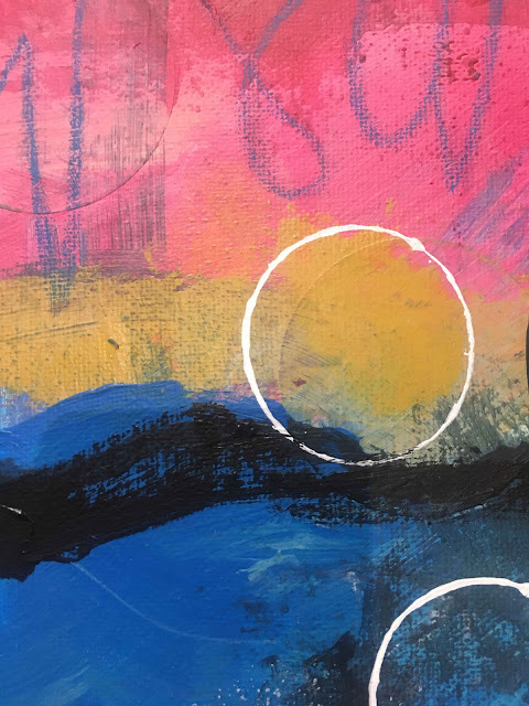 I love to see what is revealed when a painting is done because I don't start off with any idea of what I want to achieve. This is one of the five I'm doing with the same palette, so it will be interesting to see if anything similar is revealed in the others. I know there are some patterns emerging - circles (surprise 😄), and squiggles, and patches of intense white applied with a palette knife so there are 'sprays' around them.